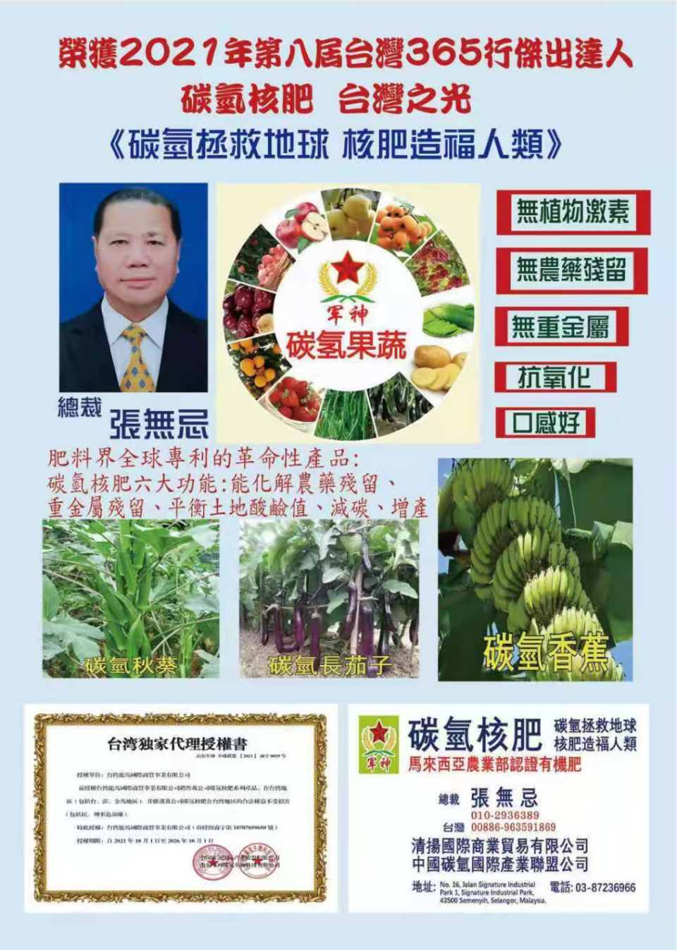 日前,一款名为“碳氢核肥”的创新有机肥料在海峡两岸农业领域引发广泛关注。该产品由山东军神碳氢生物科技有限公司、中国碳氢国际产业联盟有限公司高光林董事长(国际院士)与张无忌总裁及多位专家学者历经多年潜心研发,已获得欧盟专利及多项国际专利,并于去年荣获台湾农业杰出专利金奖,被誉为两岸农业领域的一项革命性技术成果。