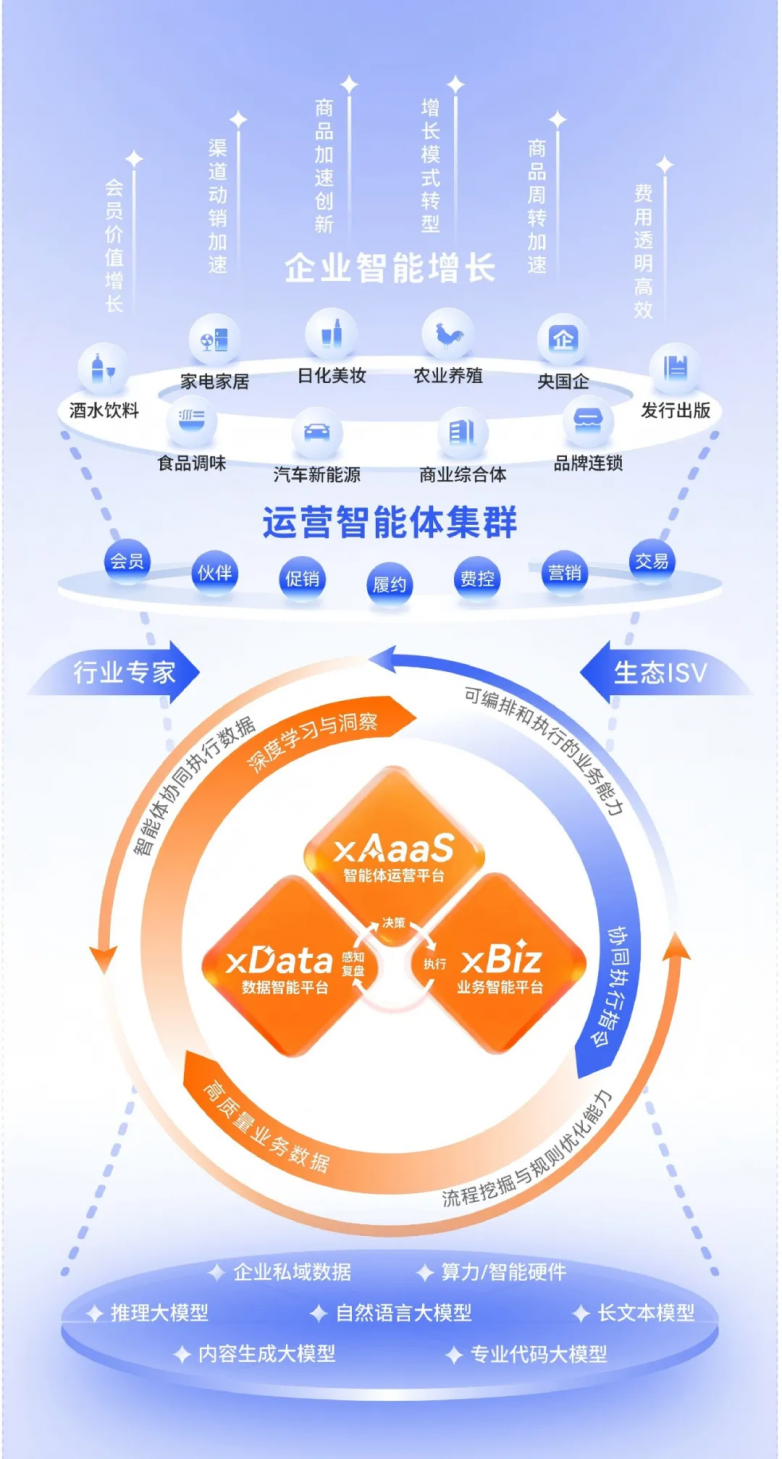 深耕大消费行业十年的云徙科技,凭借对产业需求的深刻洞察,走出了一条技术与业务深度融合的独特路径。依托服务酒饮、家电、汽车等多个细分领域头部客户的经验沉淀,云徙构建了涵盖会员运营、供应链履约等核心业务模块的行业知识体系,并在此基础上打造了 "xGOS.AI 企业运营超级智能体" 体系。该体系以 xAaaS 智能体运营平台为核心,联动 xBiz 业务智能平台与 xData 数据智能平台,形成了 "数据供给 - 智能决策 - 业务执行 - 反馈优化" 的完整闭环,如同为企业打造了一套自主进化的智能运营系统。